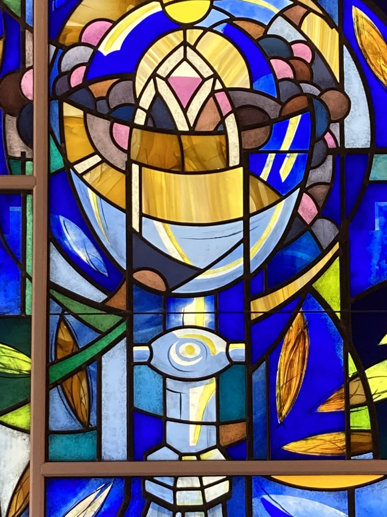 This stained glass window brings together a deeply contemplative and symbolic design, created to inspire reflection and meditation. At its heart is a chalice form that merges elements of two historic Revere chalices, gracefully framed by the spiraling geometry of a nautilus shell. The spiral culminates in the Host of the Eucharist, rendered in hand-blown antique opal and streaky glass that captures and diffuses light with a gentle, luminous quality.