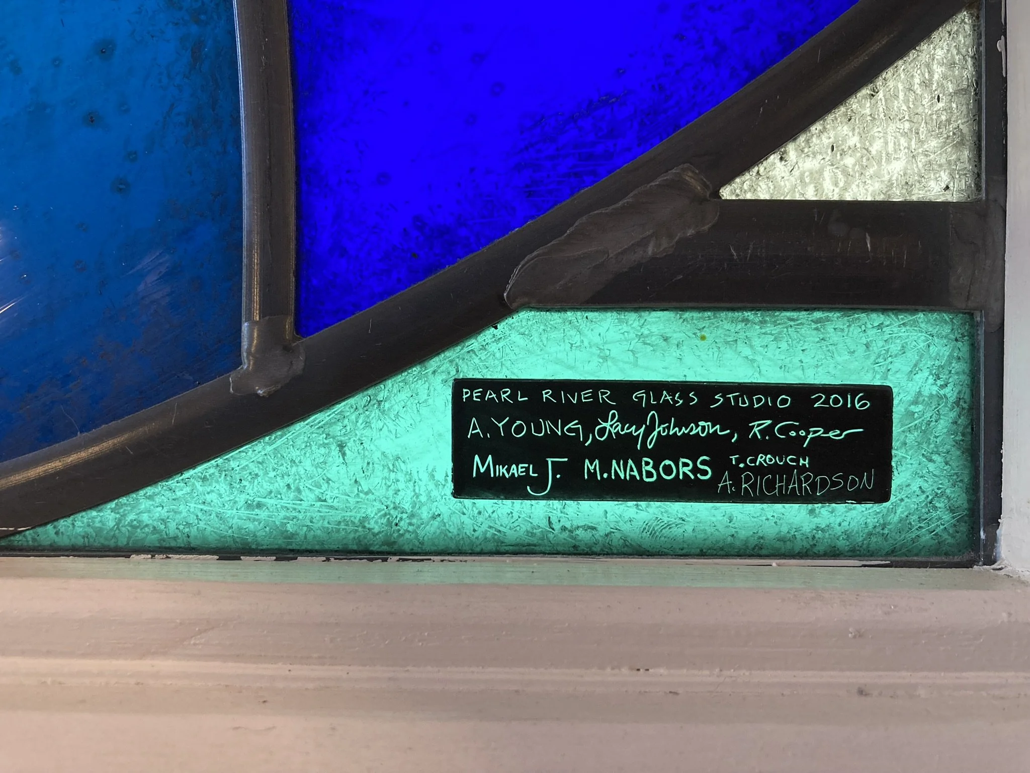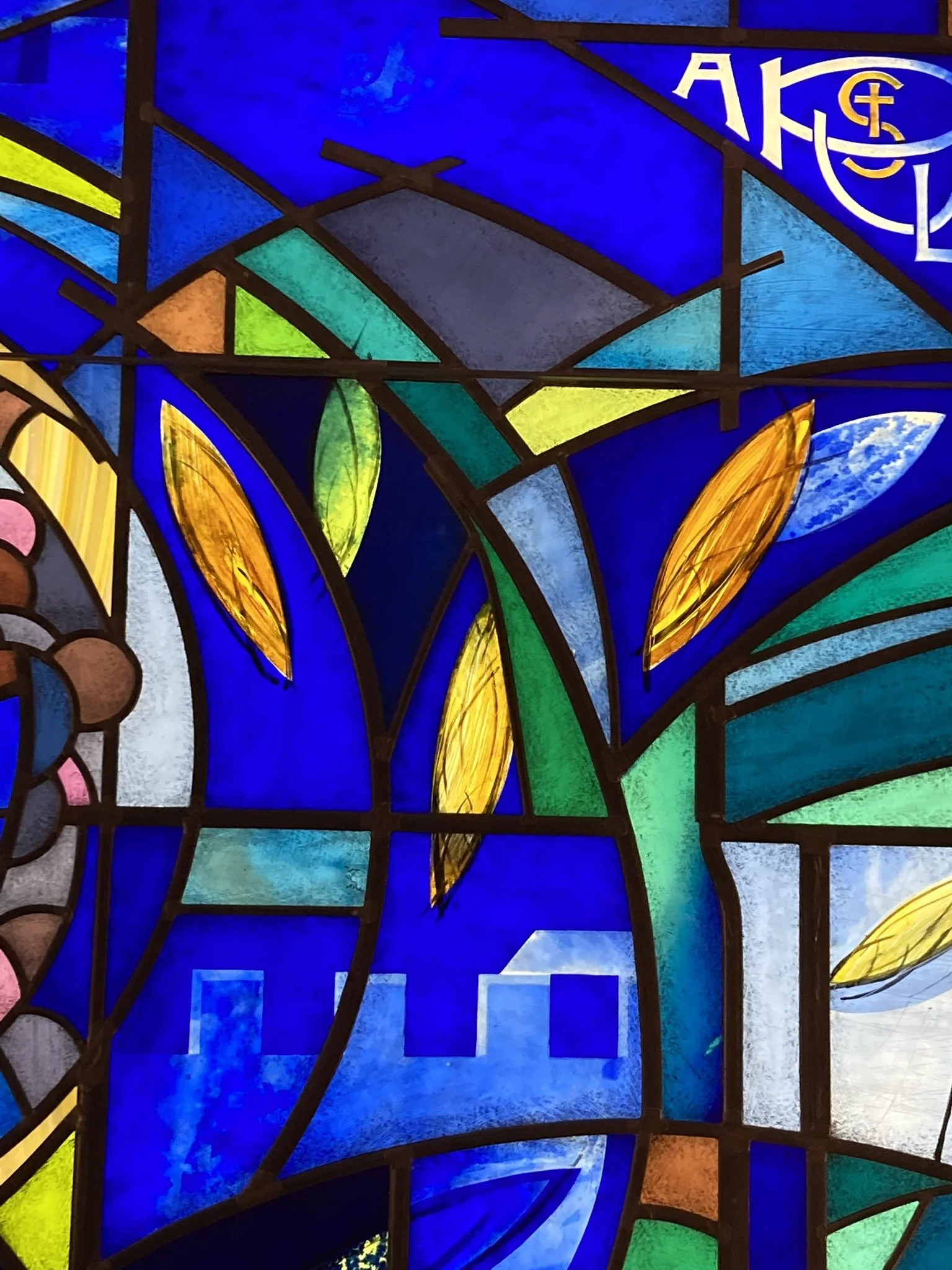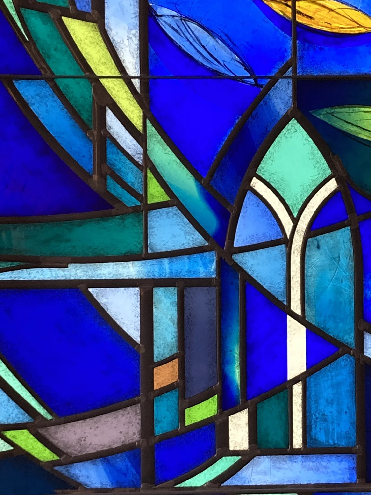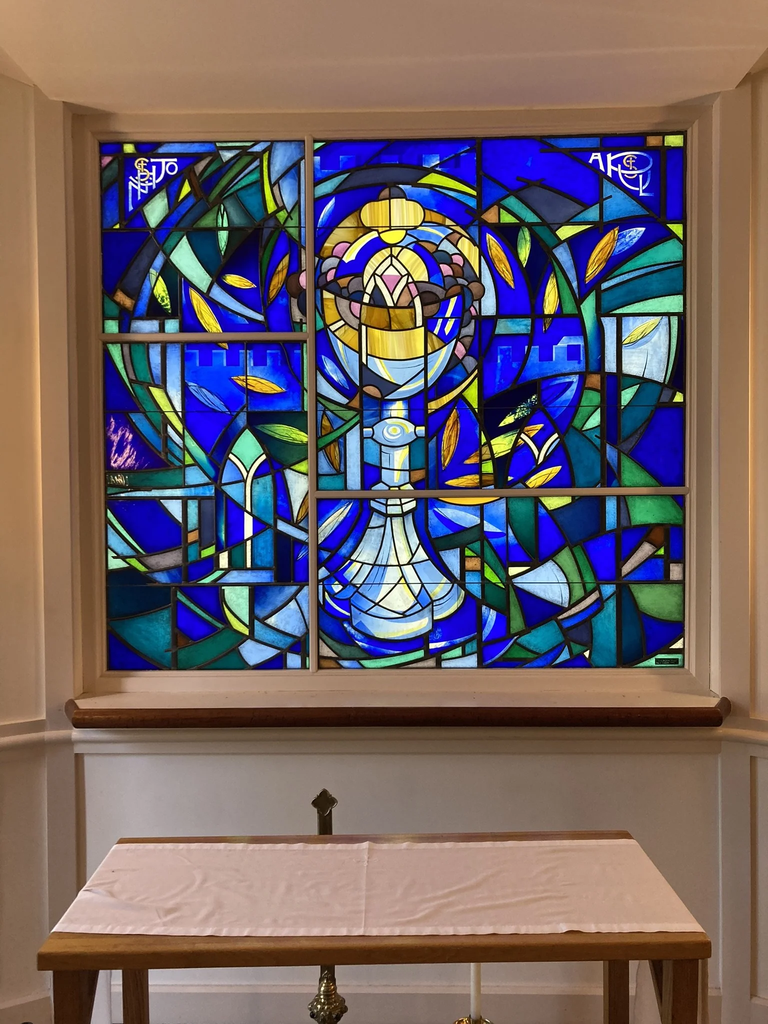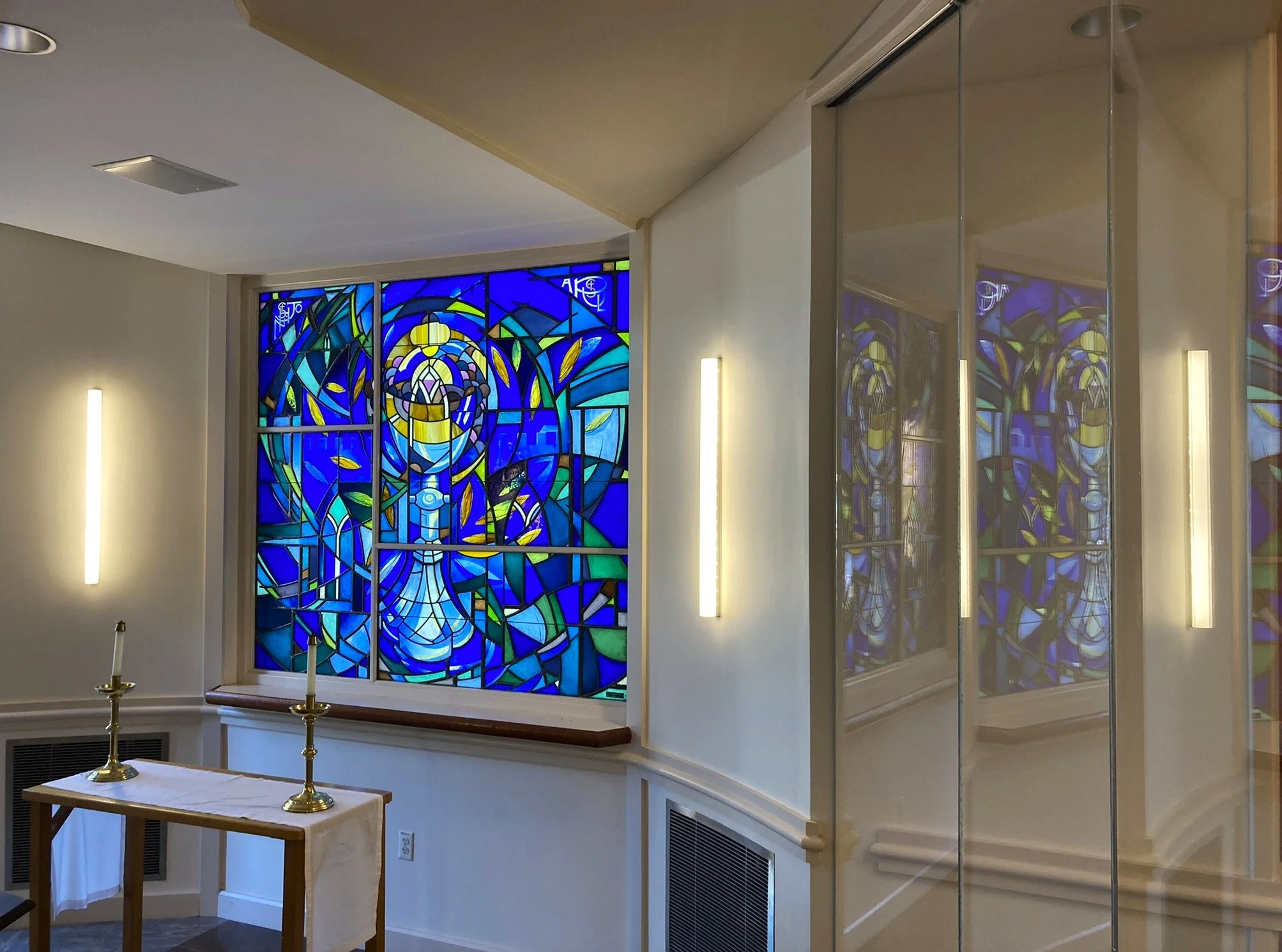 The background subtly incorporates an image of the original St. John the Evangelist Church — a quiet homage that will resonate especially with those familiar with the chapel's history. Throughout the window, cobalt blue glass, selected from the earliest stages of the design process, anchors the color palette. Accents of blue-green, evocative of the St. Paul’s logo, add depth and dimension.