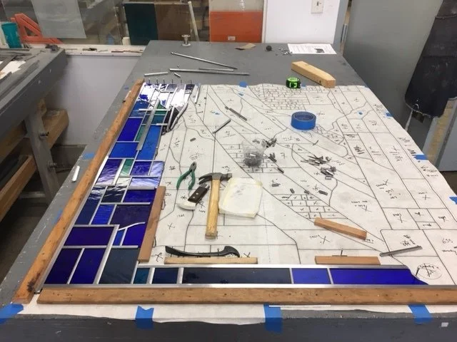 How Pearl River Glass found its way to Missouri is just one example of how many of our projects happen. This window depicts the empty Triumphant cross draped with purple robes. The Gospel tells us that the Roman centurions cast lots for his garments before crucifying Jesus. This theme emphasizes the miracle of the Easter story as a focal point in the sanctuary. The multitude of crosses became symbols for martyrs, saints, fallen Christian soldiers, and anyone in the church viewing the window.